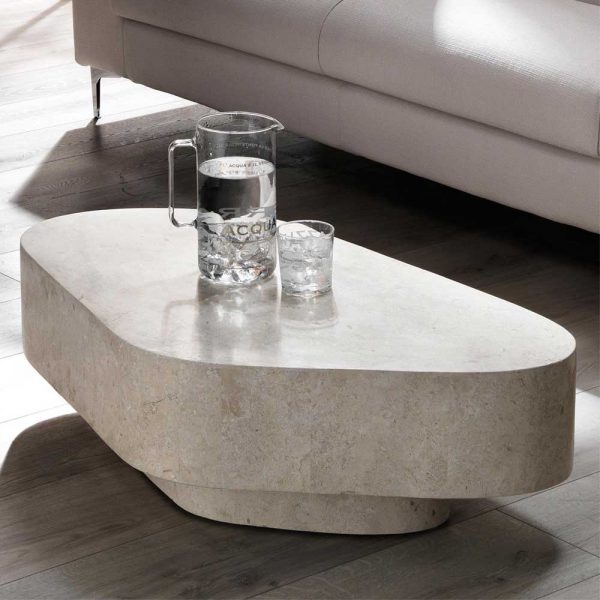 Der schwebende Couchtisch aus Stein ist nicht nur ein ästhetisches Highlight, sondern auch ein praktisches Möbelstück für den Alltag. Seine massive Steinplatte bietet ausreichend Platz für Zeitschriften, Bücher, Fernbedienungen, Snacks und Getränke. Er ist der ideale Ort, um gemütliche Stunden mit Freunden und Familie zu verbringen.