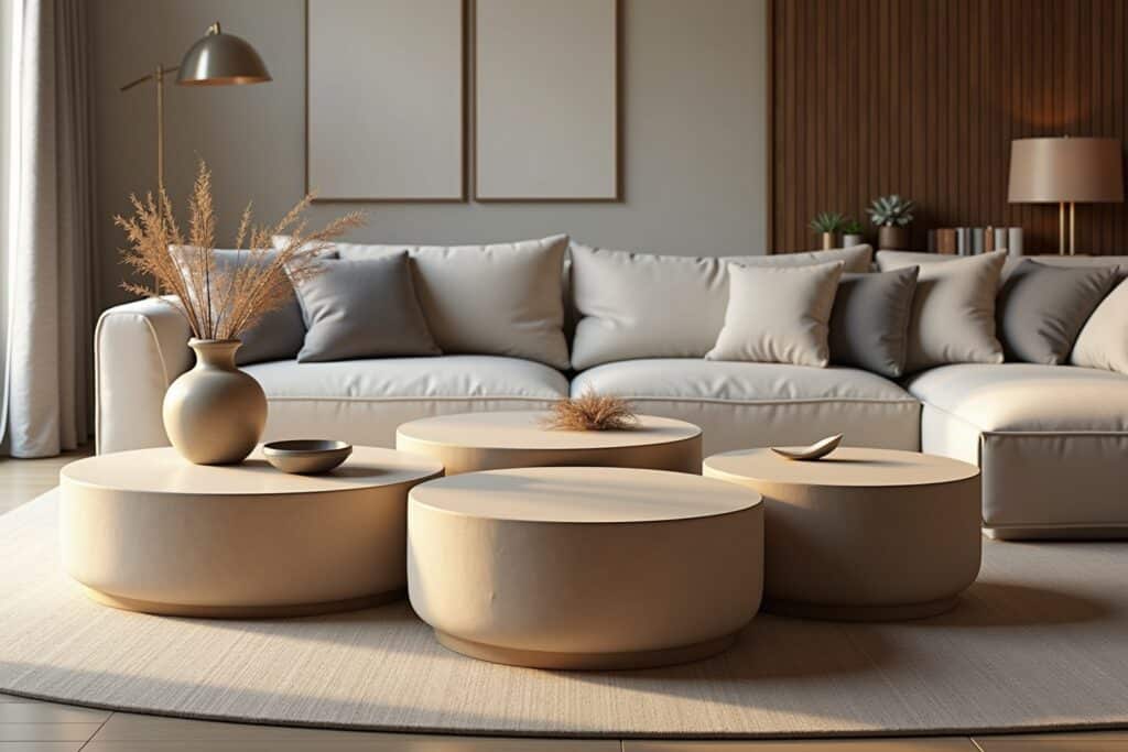Ein beiger runder Couchtisch ist ein vielseitiges Möbelstück, das sich auf verschiedene Arten in Szene setzen lässt. Hier sind einige Ideen und Inspirationen: