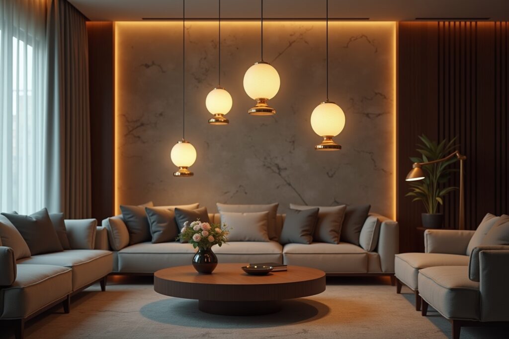 Besonders beliebt sind Pendelleuchten mit einem oder mehreren Schirmen aus Opalglas oder Acryl. Sie sorgen für eine gleichmäßige Lichtverteilung und schaffen eine angenehme Atmosphäre. Auch filigrane Drahtlampen oder geometrische Formen sind in modernen Wohnzimmern ein echter Hingucker.