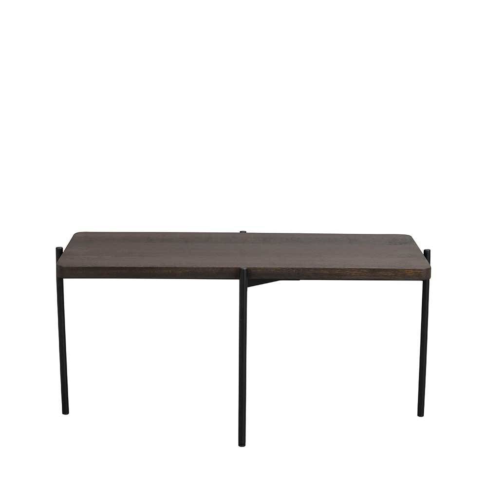 Das filigrane Metallgestell bildet einen spannenden Kontrast zur massiven Holzplatte. Es verleiht dem Couchtisch eine moderne und luftige Optik, ohne dabei an Stabilität einzubüßen. Die klaren Linien des Gestells unterstreichen die schlichte Eleganz des Designs.