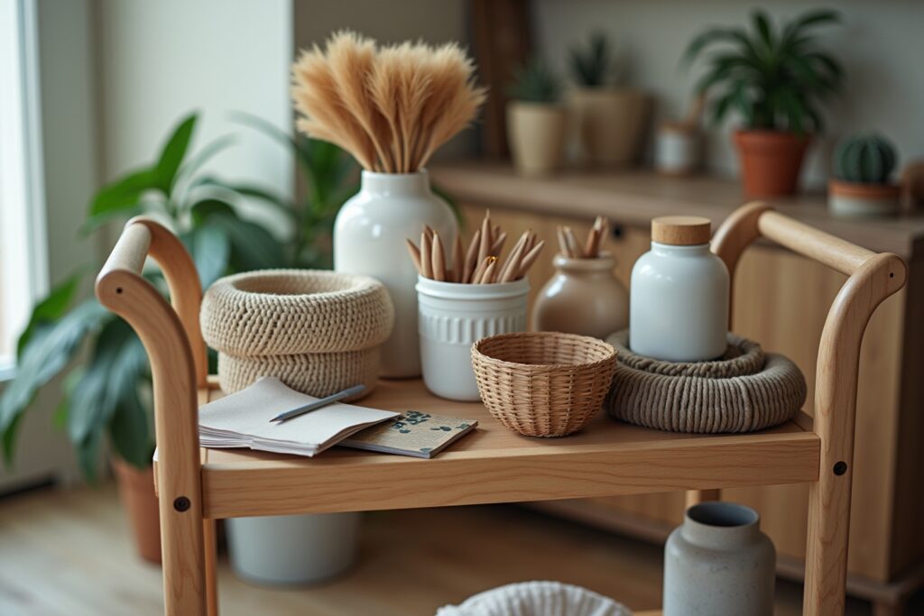 | Bastelwagen | Organisation von Kreativmaterialien | Holz, Kunststoff, Metall | Schubladen, Körbe, Fächer für Kleinteile, mobile Arbeitsfläche | Hobbyraum, Kinderzimmer, Atelier, Nähzimmer |